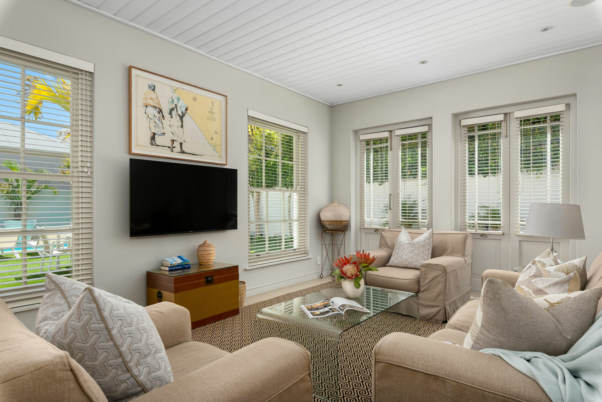 - Lounge with wood burning fireplace flanked by patio, garden, and pool areas.