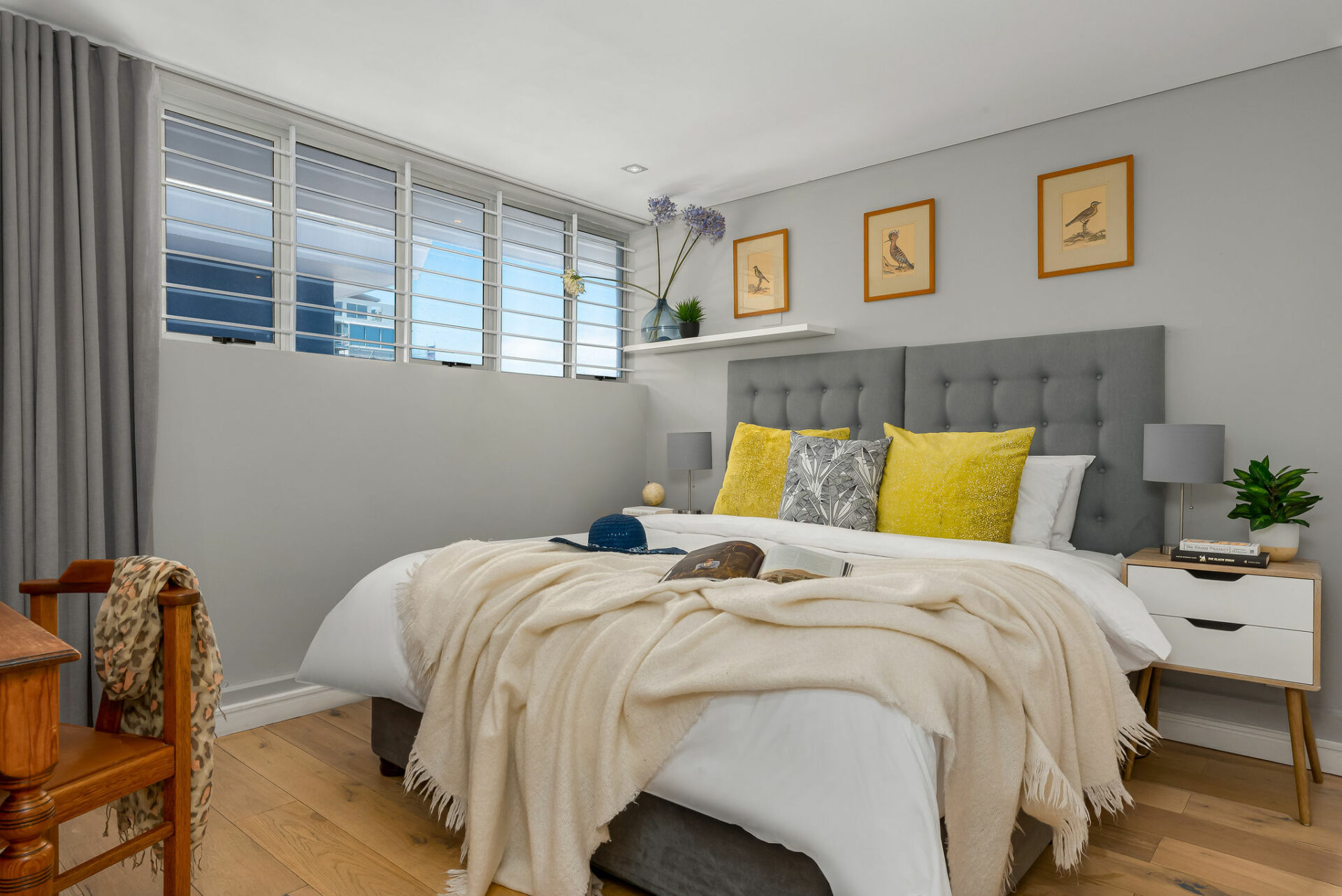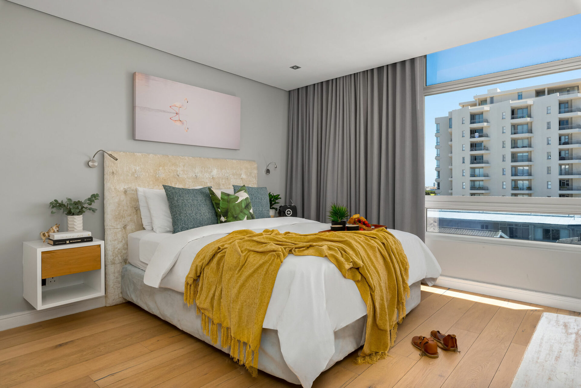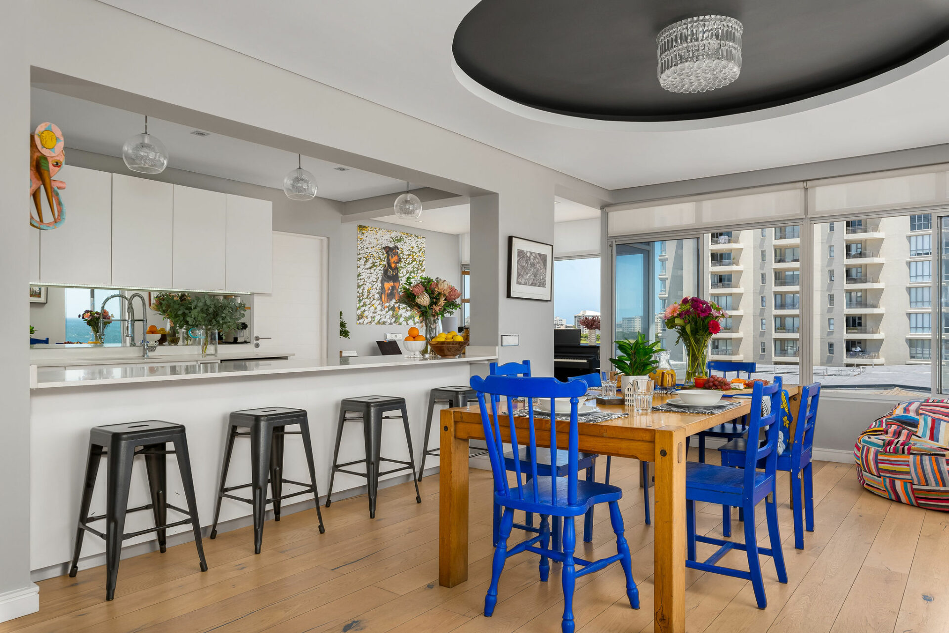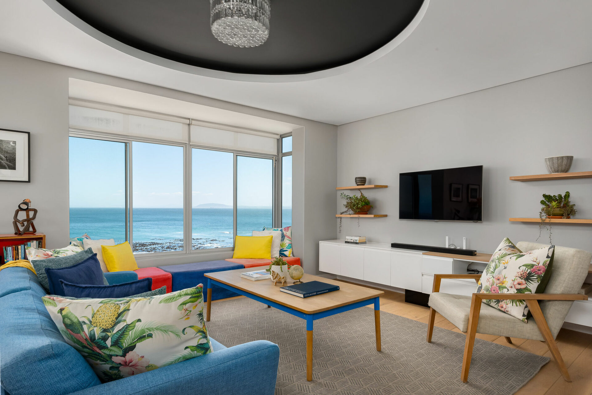 Located within walking distance of the V&A Waterfront shopping precinct and a variety of popular beachfront restaurants, staying in is also an option as the apartment’s open-plan kitchen-dining-lounge area boasts large sliding windows that invite the outside in. Surrounded by sea and mountain views, think of a holiday rhythm that is set by the changing light of the rising or setting sun, by the ebb and flow of the ocean, and from watching the passing ships – and every so often dolphins, whales, and local surfers – in the ocean less than 20m away.