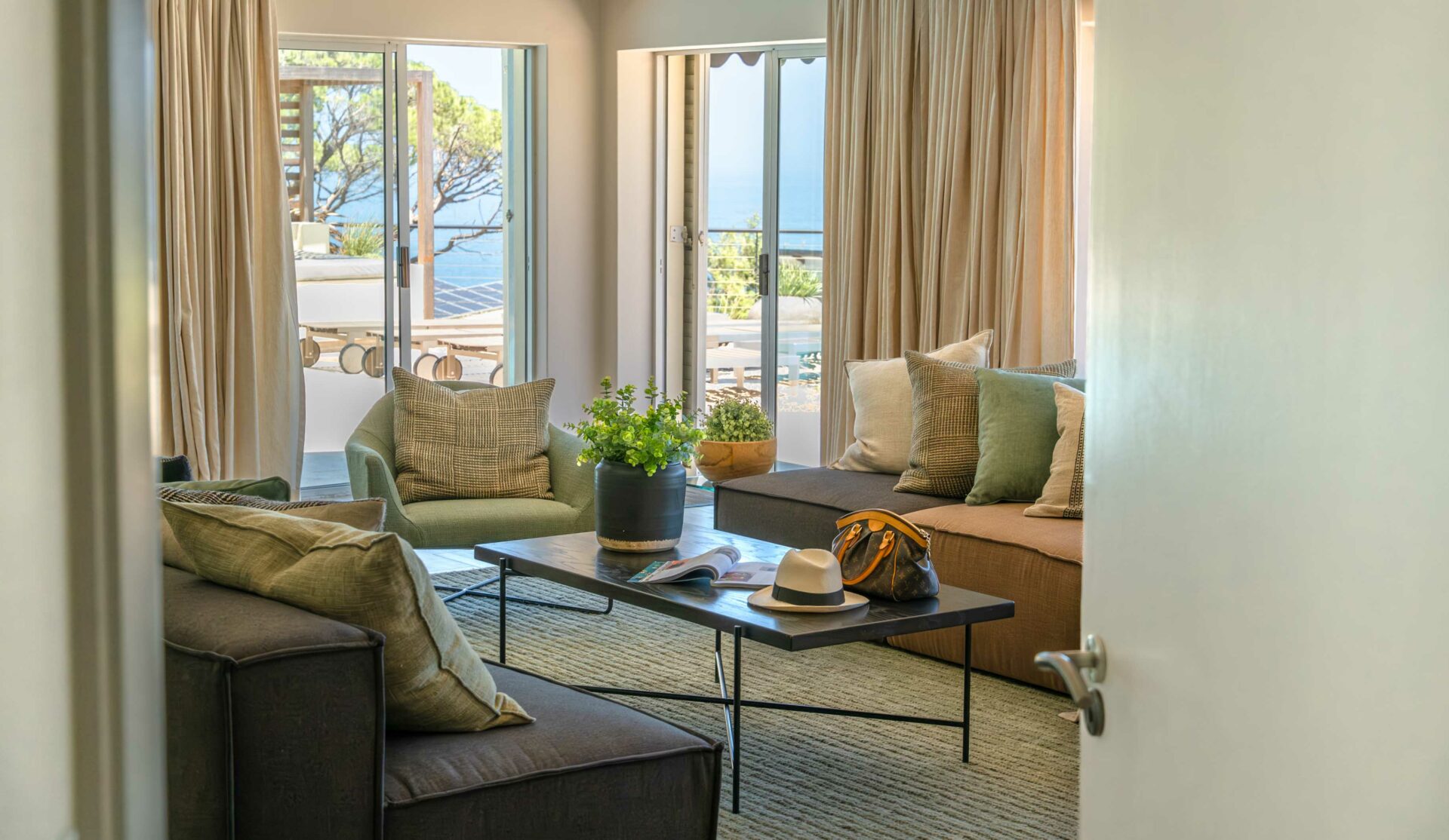 King X-Length (can be separated into twins touching), 2 full bathrooms: his with a walk in shower, single basin and toilet; hers with a free standing bath, double basins, toilet and bidet. Between the bathroom an open plan dressing nook with console and comfortable chair. Sliding doors open up to private balcony with sea views, small sitting room and TV, Digital safe.